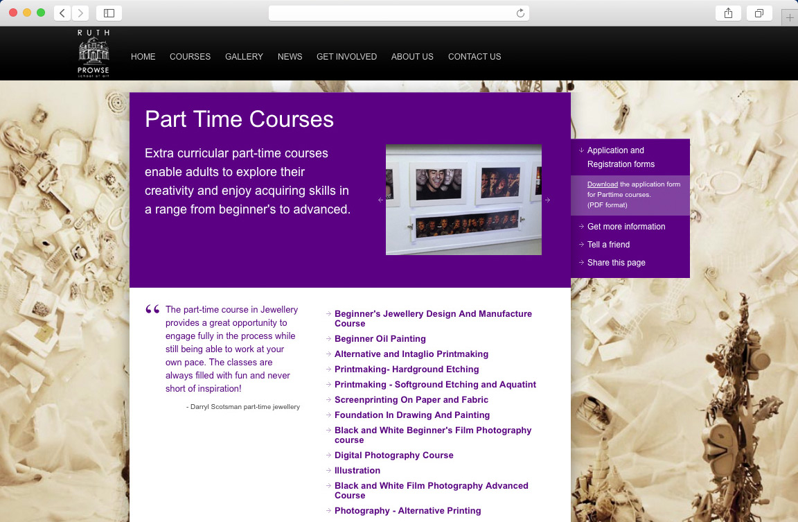 On top of large visuals sit interactive course information panels, detailed course descriptions, colour-coded pages for ease of navigation, and a gallery of student work. The site also has dedicated pages for Part-time and Outreach courses.